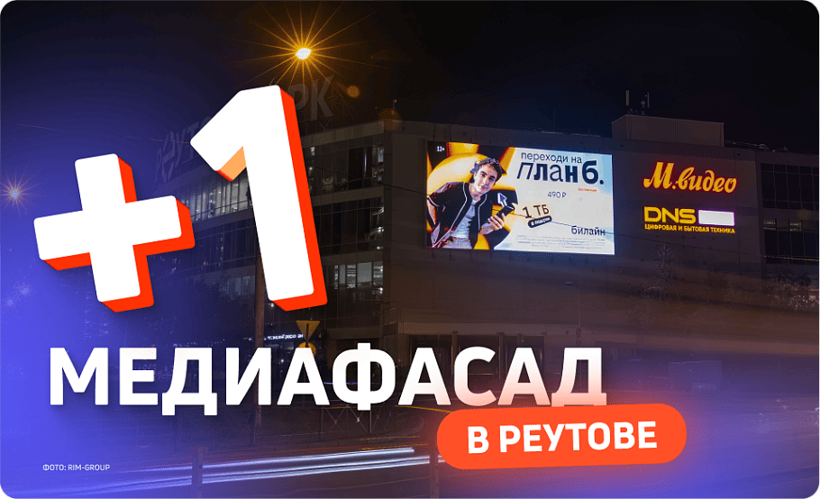 У Медиагруппы «РИМ», крупного рекламного холдинга, новый партнерский медиафасад в Реутове. Огромный экран размером 18×10 метров установлен на фасаде ТРЦ «Реутов Парк» и уже готов привлекать внимание ваших потенциальных клиентов!